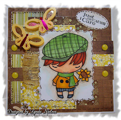 I did a little bit of paper piecing here, on Ian's hat, and scarf. The papers that I used for this card are from Basic Gray called "Origins". I colored my image using Copics, and the butterflies are from K&Company.